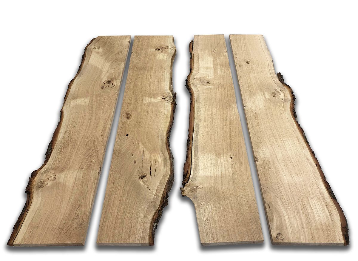 A four-board-pack of surfaced, kiln-dried Character English Oak Boards. Each board has one long live edge and all other edges are square. The live edge is supplied completely natural and may or may not include bark, which tends to become detached as the timber dries. The boards are a character grade displaying plenty of natural character and pip.
